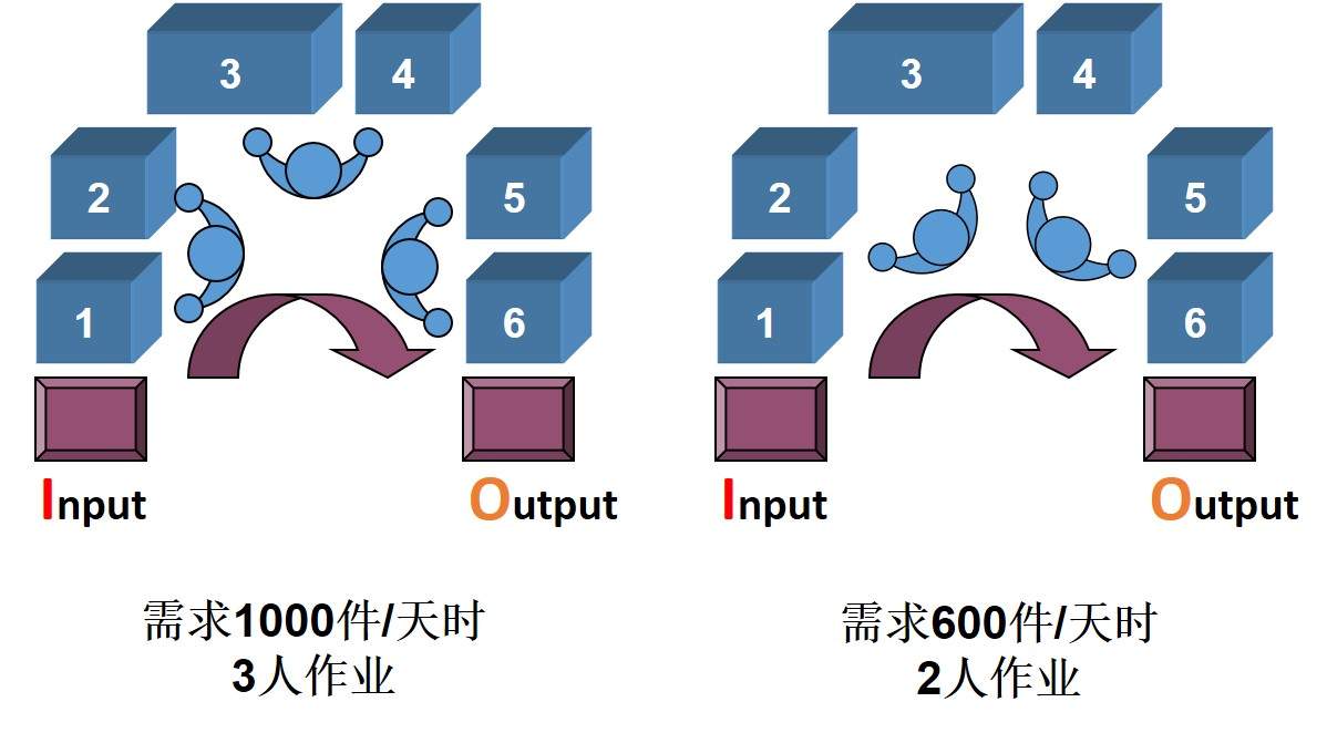 如果将生产设备一字摆开,工人从第一台设备到最后一台设备就需要走动很远的距离,从而造成严重的人力浪费。因此,“一个流”生产要求将生产设备按照“U”字型来排列,从入口到出口形成一个完整的“U”型,这样就可以大量的减少由于不同工序之间的传递而造成的走动,减少时间和搬运的浪费,增加生产效率。
