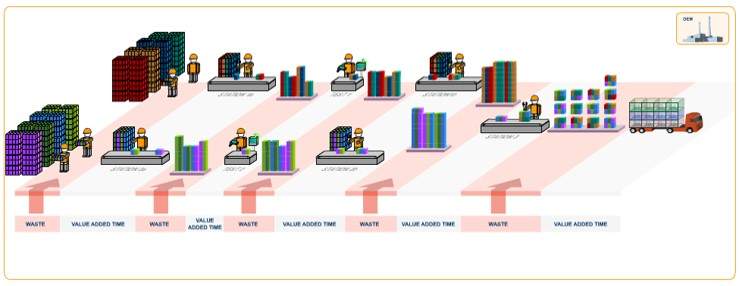 做一个、传送一个、检查一个,将制品经过各加工工序而做成完成品。 单件流动是将浪费“显现化”的思想与技术,在原有状况的基础上以单件流动方式试做,将批量生产时发现的不了的浪费显示出来,以此作为改善及建立流线化生产的起点。