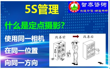 5S管理公司推进的工具之一:定点摄影,是指使用同一部相机站在同一位置、同一高度、同一方向,对同样的物体在改善过程中进行连续摄影,以便清晰地对比改善过程中的状况,让员工知道改善的进度和改善效果。定点摄影可运用于5S活动中的各个阶段,作为活动推行的一个前后对比或阶段对比。它是由日本杉山友男首先提出并加以推行的,也是一种常用的5S管理公司活动方法。