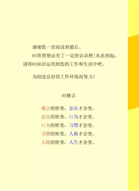 6S管理之素养的要领:1.摒弃工作方面的传统思维方式;2.不要试图辩解,应寻求解决的方法;3.首先,从否定性观点分析工作现场......