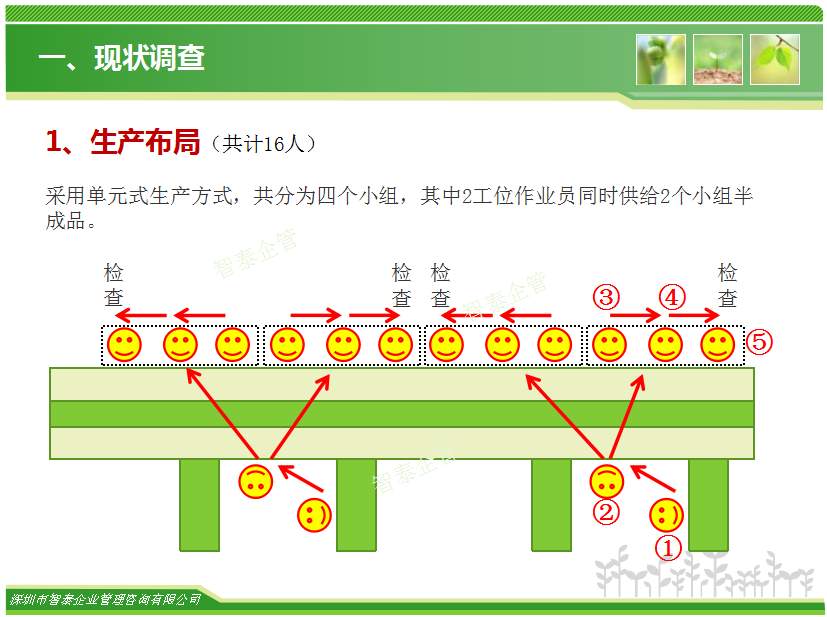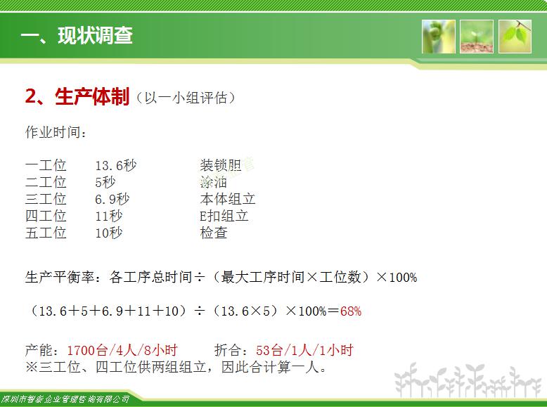 在精益生产中车间经常要改进的内容是生产线上的生产平衡率问题,目前国内加工型企业的生产平衡率只有65%左右,对于智泰专业团队来说,这里面的改善空间巨大,通过智泰人的努力,在企业推进生产平衡率平均提升到85%以上,阶段为生产效率提升案例,请查阅: