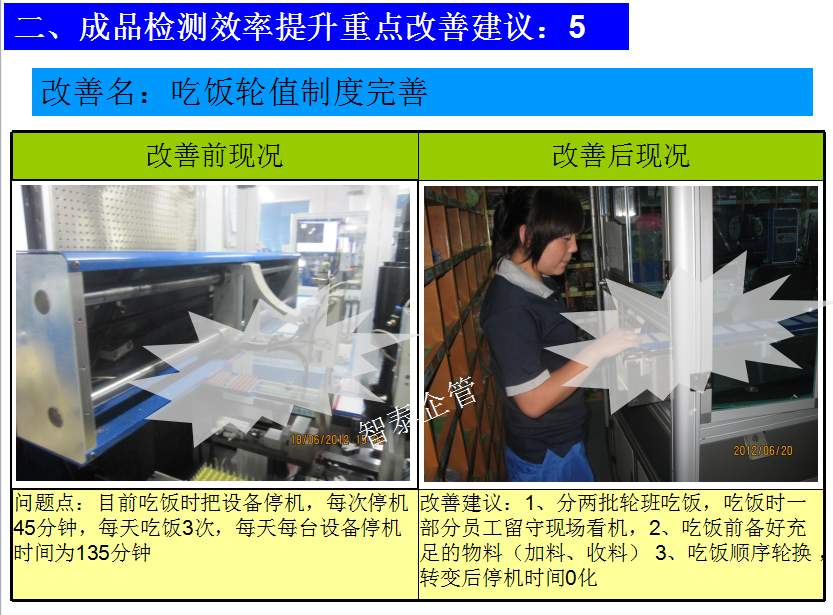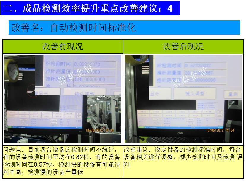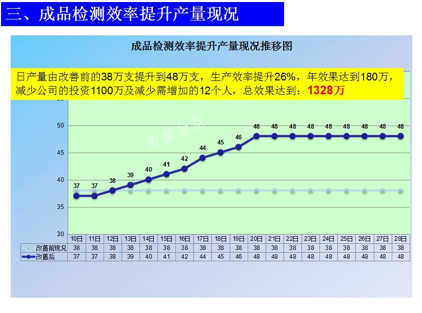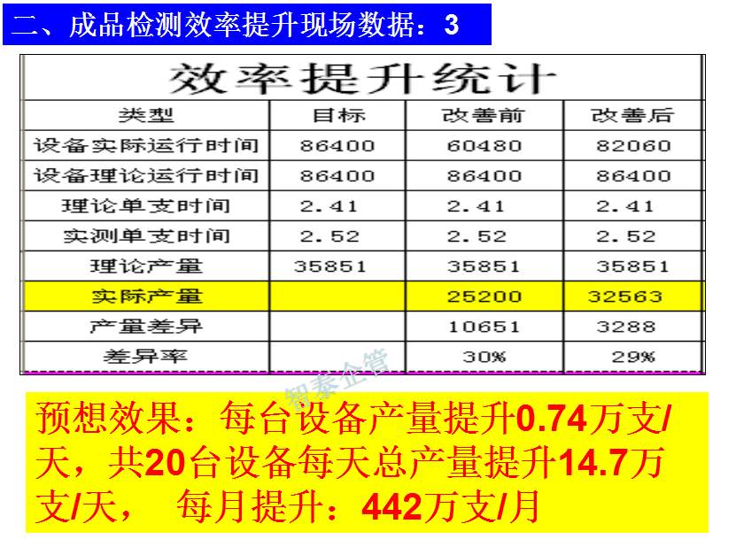 世界级制造及精益管理是智泰人一生追求的理想,智泰咨询在企业推进精益生产后平均生产效率提升35%以上,智泰专业团队为企业消除八大浪费,通过精益管理,提高企业的生产效率和产品质量,持续推进焦点课题改进重大问题,每年给企业带来的收益平均有800万以上,附件为智泰咨询顾问团队为某企业生产效率提升的案例,请查阅: