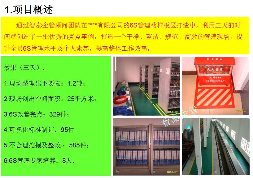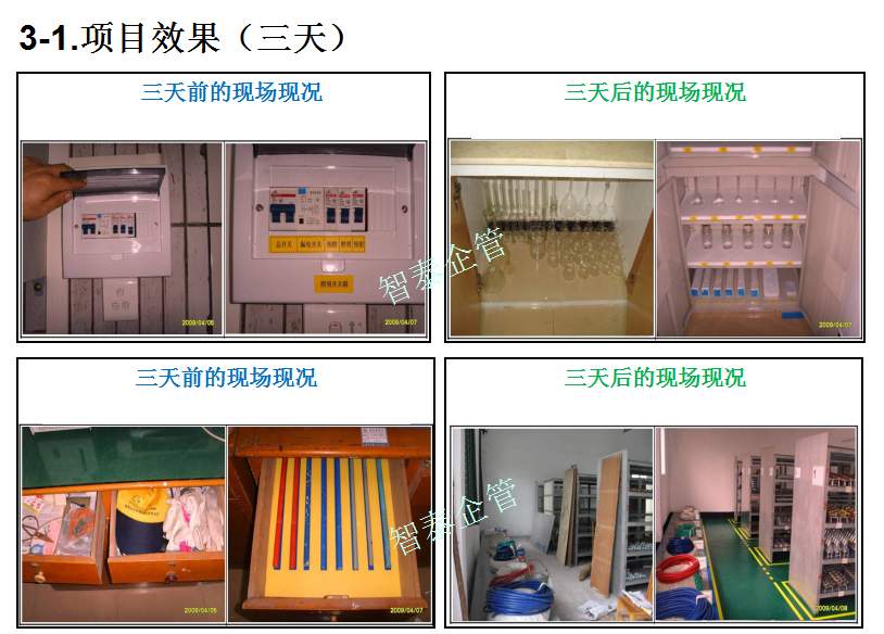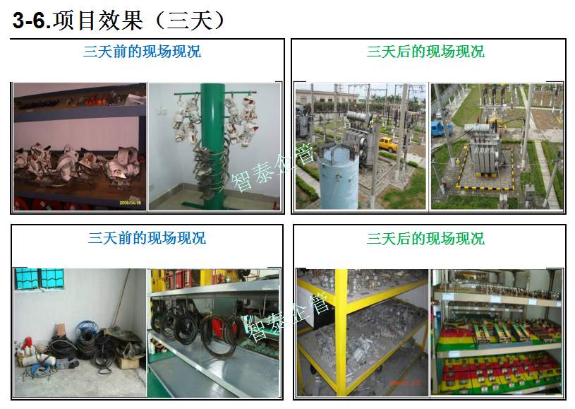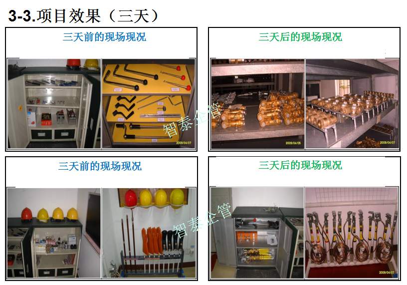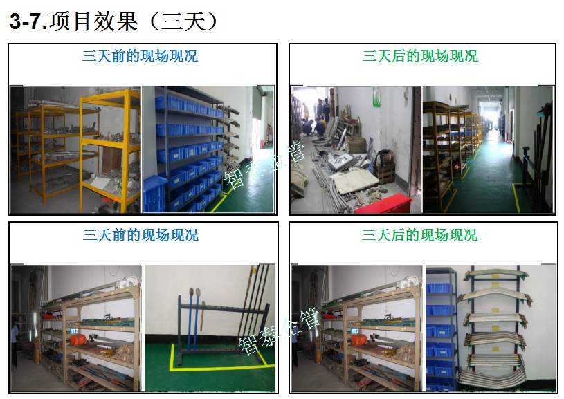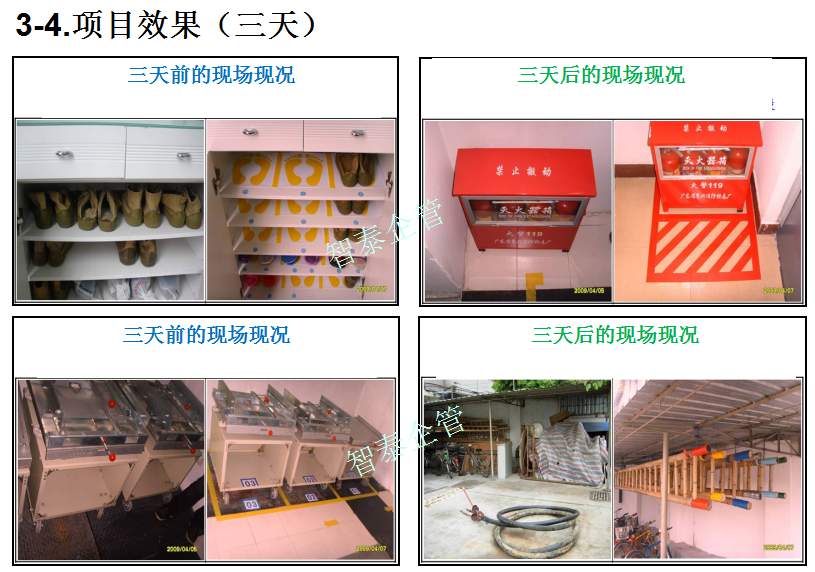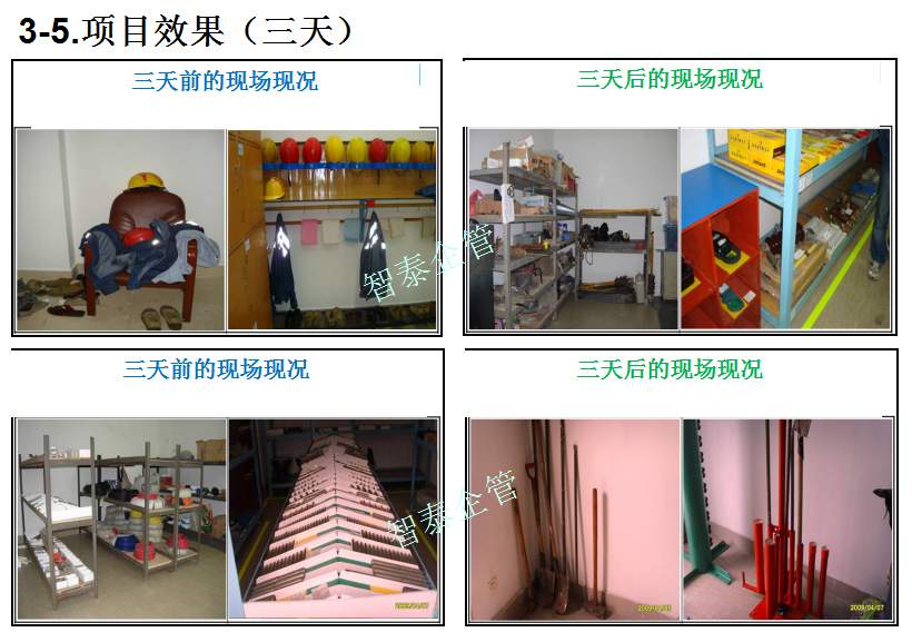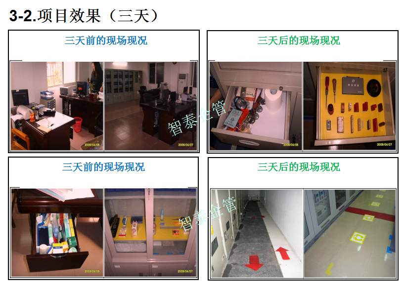 智泰咨询下属的5S管理公司首创的产品三天一标杆,三天一条线,三天缔造6~8个标杆车间,智泰咨询专业的顾问团队为企业的5S管理快速打造已形成一套标准内容,能够快速在企业全面推进5S管理,附件为智泰咨询为某企业快速打造5S管理样板区三天前后对比的现况,请查阅: