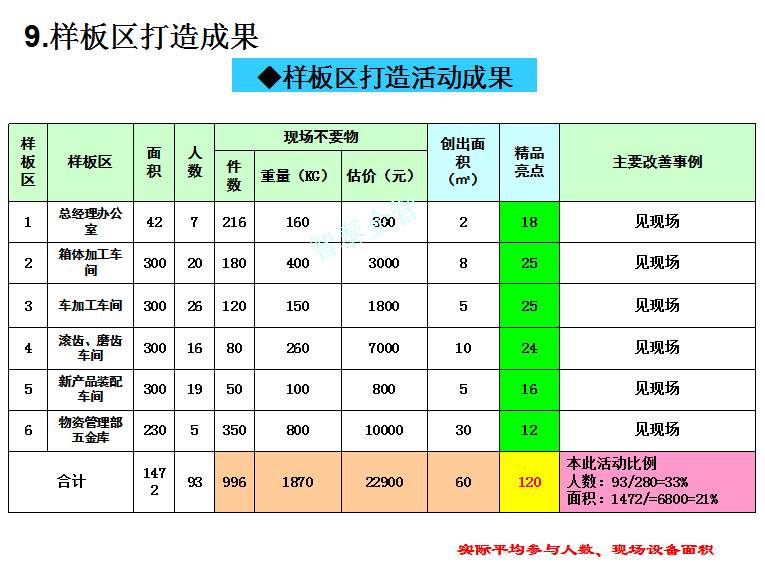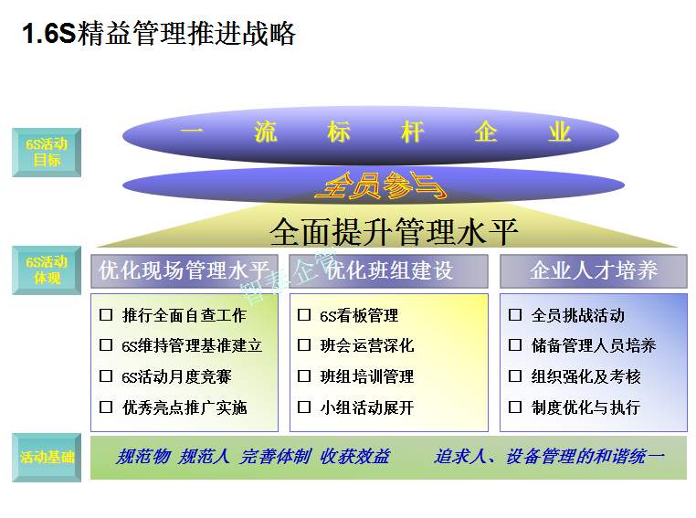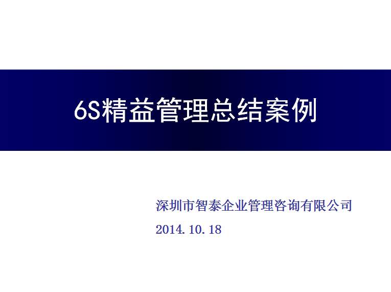 深圳智泰下属6S咨询公司在国内对不同行业推进6S管理,98%以上取得非常满意的效果,智泰专业团队三天为企业打造成功6~8个标杆车间,6S咨询公司快速为企业达成6S管理目标而努力奋斗,企业要想成为行业的标杆,必须持续推进现场管理,比如6S或TPM管理等,现场管理好的企业不一定是标杆企业,但标杆企业的现场管理一定是优秀的。附件为企业6S管理推进总结内容,请查阅: