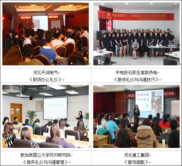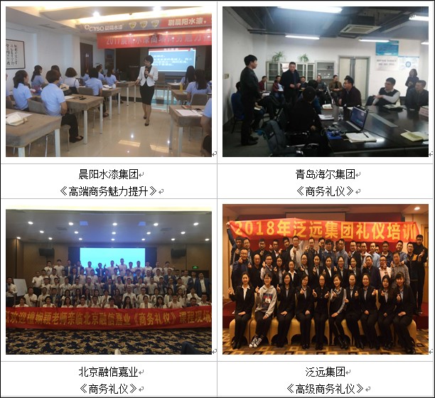 ▲曾为美的、以纯、青岛海尔集团、宁纺集团等10余家家纺电器企业进行《商务礼仪》《接待与宴请礼仪》《现代职场商务礼仪与交往艺术》课程培训,其中,《商务礼仪》课程被海尔大学返聘8期。