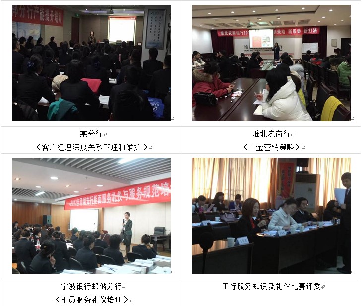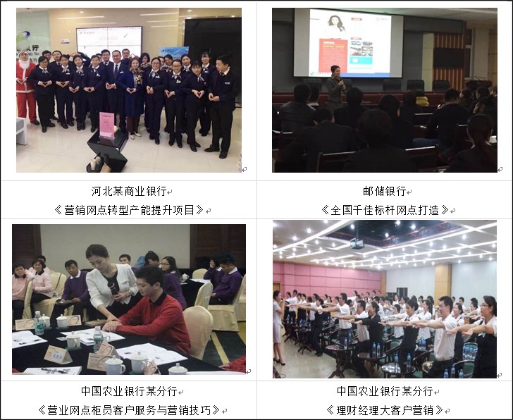 ▲ 曾为河北某商业银行的网点人员讲授《银行客户经理营销技巧》课程,让学员掌握如何开发客户,管理客户,多渠道合作的技巧能力,最终实现网点业绩30%的提升和分行零售业绩20%的整体增长,获得企业的频频点赞,后续返聘5期。