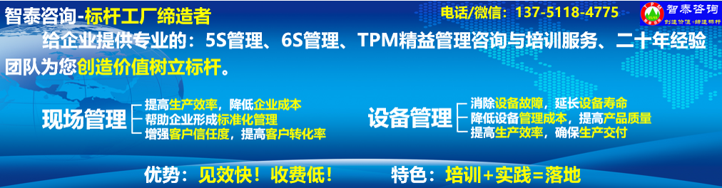 智泰咨询下属的5S管理公司首创的产品三天一标杆,三天一条线,三天缔造6~8个标杆车间,智泰咨询专业的顾问团队为企业的5S管理快速打造已形成一套标准化内容。