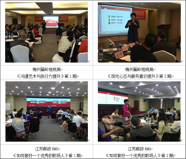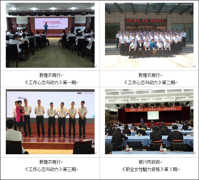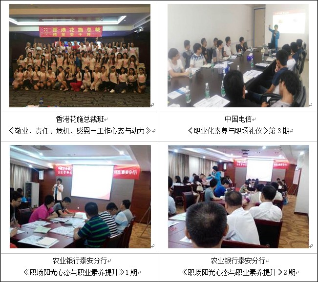 2012年至2014年为河南省邮政、山东省农行、广东省中行、浙江省建行、广东省工行、广东省农信社、广西农信社进行《阳光心态与职业素养提升》、《正能量与责任》全省轮训共110余期,学员满意度都高达97%以上,返聘率高达85%。